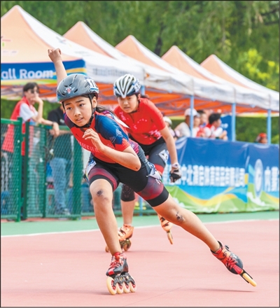 青少年選手在參加2025內蒙古國際輪滑公開賽速度輪滑比賽。