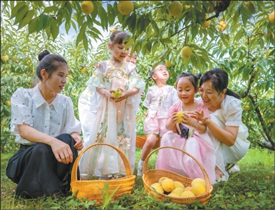 安徽省蕪湖市繁昌區孫村鎮“樂田小鎮”生態農莊桃園,家長帶領孩子們在體驗黃桃採摘。
