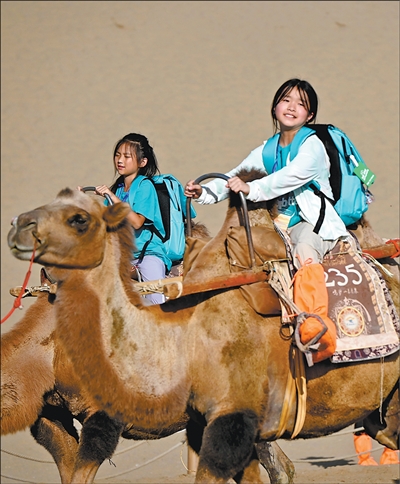 甘肅省敦煌市鳴沙山月牙泉景區,小朋友在體驗騎駱駝。