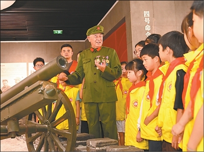 江蘇省宿遷經濟技術開發區古楚街道朱圩社區愛心暑託班開展紅色研學活動,孩子們在聽老兵講述紅色故事。