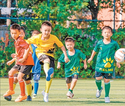 江西省吉安市峽江縣足球夏令營,孩子們在進行足球訓練。