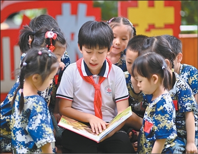 位於重慶市沙坪壩區的四川外國語大學附屬小學校幼兒園,少先隊員為幼兒園小朋友朗讀紅色故事。