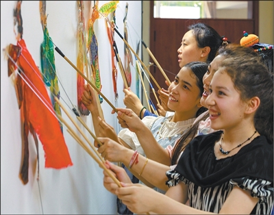 新疆維吾爾自治區烏魯木齊市天山區勝利路街道羊毛湖社區,孩子們在體驗皮影戲表演。