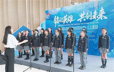 7月8日,上海宋慶齡學校學生合唱團在“銘記英雄 共創未來”飛虎隊主題歷史圖片展開幕式上演唱歌曲《友誼地久天長》。