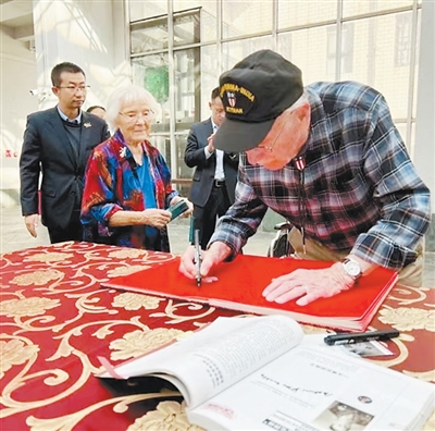 飛虎隊老兵麥克馬倫(右一)參觀昆明飛虎隊紀念館後寫下留言:“時隔80年來到昆明,看到現代昆明的巨大變化,真是太棒了。”