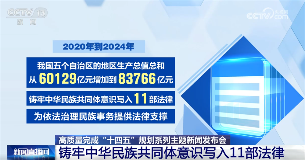 據瞭解,2020年到2024年,我國五個自治區的地區生產總值總和從60129億元增加到83766億元。鑄牢中華民族共同體意識寫入11部法律,為依法治理民族事務提供法律支撐。