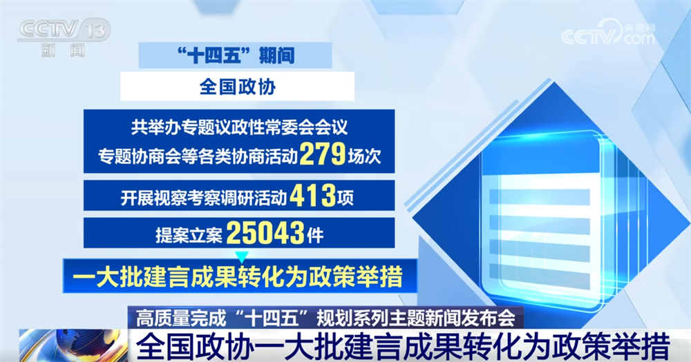 “十四五”期間,全國政協共舉辦專題議政性常委會會議、專題協商會等各類協商活動279場次,開展視察考察調研活動413項,提案立案25043件,一大批建言成果轉化為政策舉措。