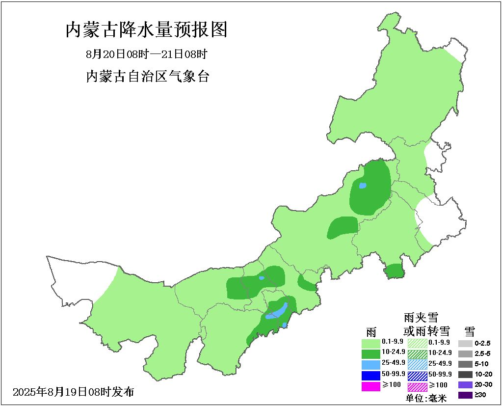 20日08時至21日08時,全區大部地區多雲,有小雨或雷陣雨,其中,巴彥淖爾市東部、鄂爾多斯市東北部、包頭市中部、呼和浩特市大部、烏蘭察布市西部和東部部分地區、錫林郭勒盟東部、赤峯市南部有中雨,鄂爾多斯市東北部部分地區、包頭市東北部、呼和浩特市中部和南部部分地區、錫林郭勒盟東北部有大雨,局地有暴雨,上述部分地區伴有短時強降水、雷暴大風、冰雹等強對流天氣;中西部大部地區4、5級短時6、7級局地8級西北風或西南風。