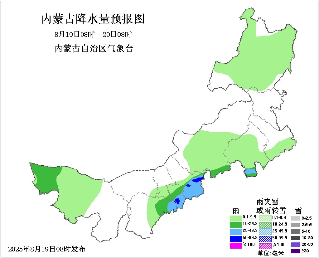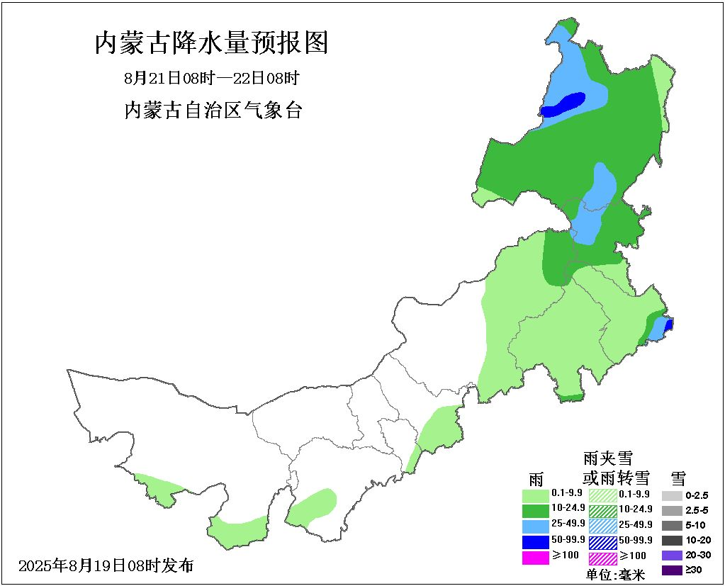 預計,未來三天(8月19日-21日),內蒙古河套及以東地區有中到大雨,局地暴雨,並伴有短時強降水、雷暴大風、冰雹等強對流天氣,需積極防範局地強降水引發的山洪、中小河流洪水、地質災害、城市內澇等次生和衍生災害。建議公眾謹慎前往山區、河谷等地質災害隱患點,儘量不要在河道等區域露營過夜。