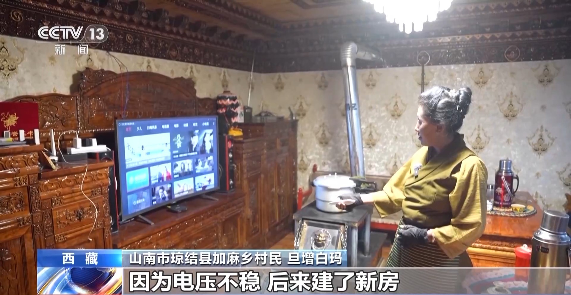 *山南市瓊結縣加麻鄉村民 旦增白瑪:*這個是2023年新建的,這邊是以前住的地方,只有一個燈泡,其他家電也不敢用,因為電壓不穩。後來建了新房,現在電壓穩了,可以放心看電視,而且還買了很多新家電,冰箱、洗衣機、電視。