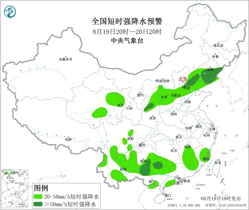 預計8月19日20時至20日20時,華北中部、東北地區南部等地的部分地區將有8級以上雷暴大風或冰雹天氣,其中,遼寧南部、天津中南部、陝西東北部、山西中部、河北東部等地的部分地區將有10級以上雷暴大風,最大風力可達11級以上;西北地區東部、東北地區南部、華北東北部和中部、西南地區東部、華南西部等地的部分地區將有小時雨量大於20毫米的短時強降水天氣,其中,遼寧中南部、甘肅東部、河北東部、天津中南部、貴州南部、廣西北部等地的部分地區小時雨量大於50毫米,最大可達80毫米以上。