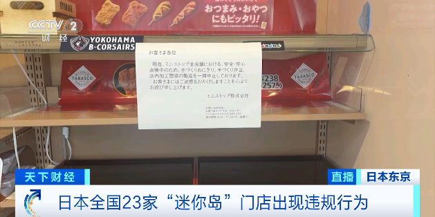 財經頻道特約記者 李茜文:昨天(18日),“迷你島”發佈公告稱,部分門店存在“針對店內製作的飯糰、預製菜食品等”偽造保質期的違規行為,*並向消費者和相關方致歉,*在查明原因和落實整改之前,所有門店將暫停銷售店內製作的飯糰、預製菜以及便當類商品。記者進到東京市區一家門店內轉了一圈,發現店內已經貼出了通知,並將相關商品全部下架。