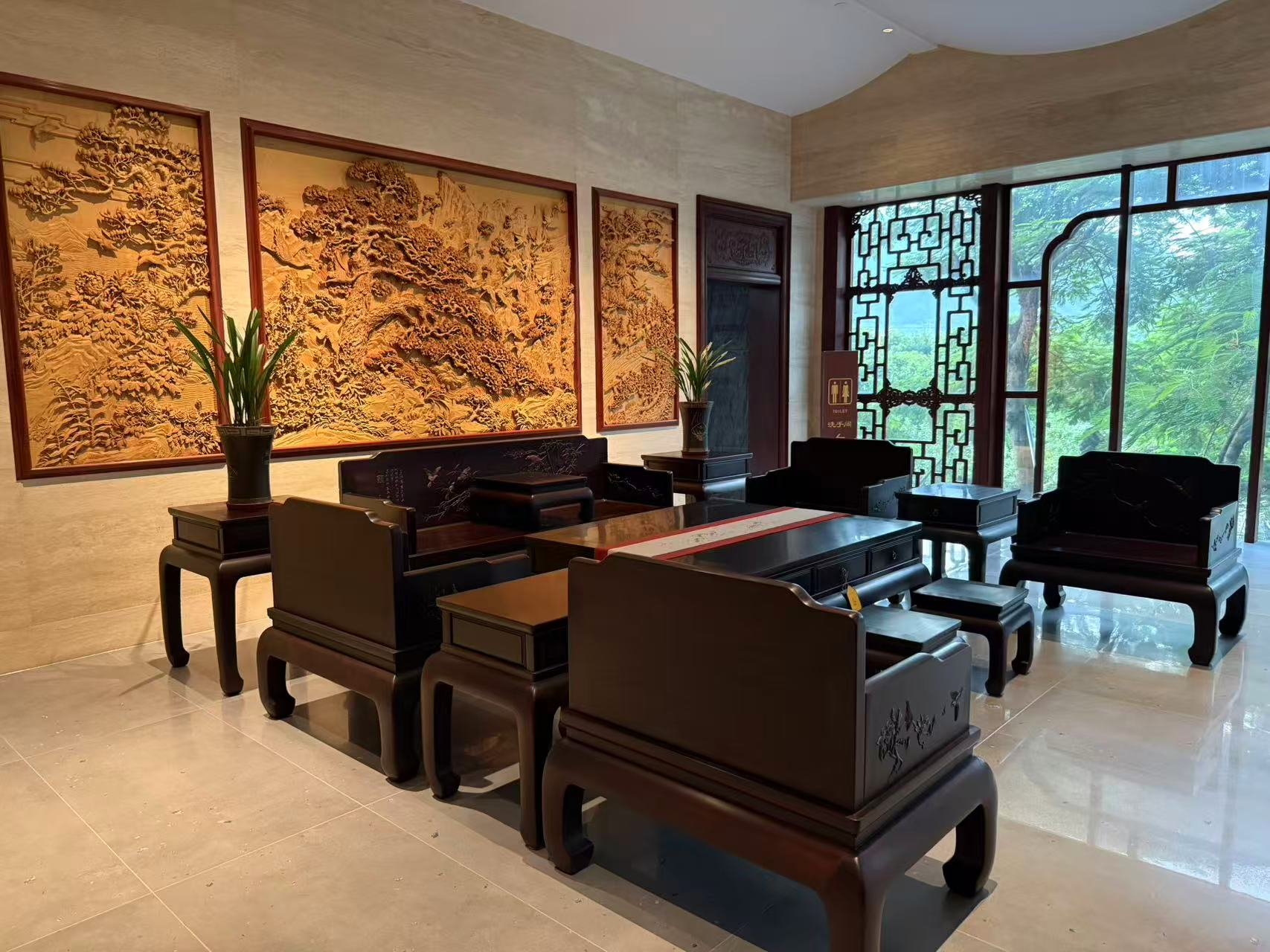 三福藝術展示館內,紅木傢俱精緻擺放。
