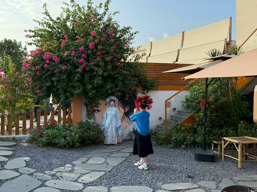 正值暑假,福建省泉州市豐澤區蟳埔村遊人如織。閩南紅磚古厝之間,頭戴簪花的遊客隨處可見,目之所及宛如移動的花海。