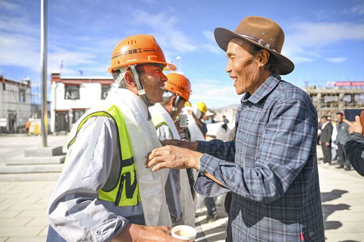 機器的轟鳴聲與悠揚的藏民族歌曲交織在一起,村民們依次向援建者獻上潔白的哈達、斟滿飄香的酥油茶,還有村民用大拇指蘸着白色的糌粑在他們身上點個指印,宛如一個個真誠的“點贊”,場景温暖感人。