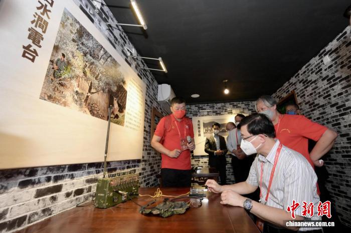 2022年9月3日,香港特區行政長官李家超(右一)出席香港沙頭角抗戰紀念館揭幕典禮時,在紀念館“石水澗電台”展區體驗抗戰時期電台工作。(資料圖)(香港特區政府新聞處供圖)