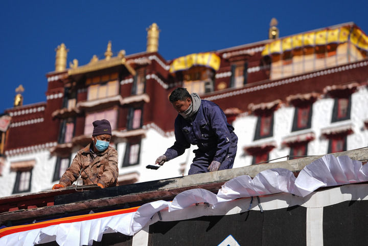布達拉宮管理處維修科工作人員在粉刷牆體(2024年12月4日攝)。新華社記者 晉美多吉 攝