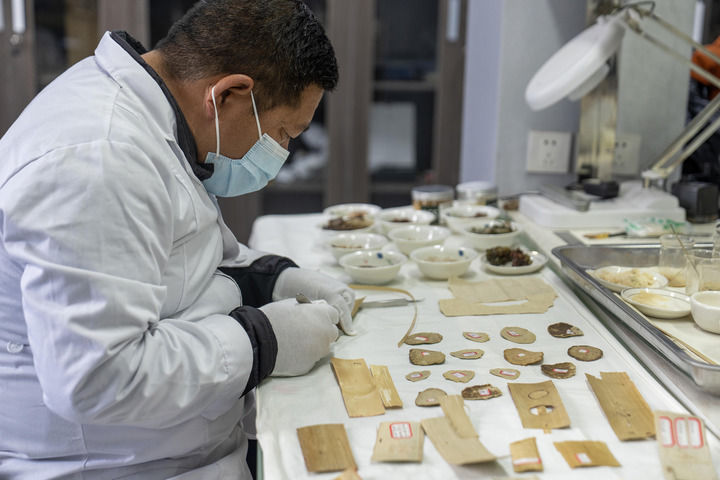 布達拉宮貝葉經實驗性修復小組實驗室工作人員對貝葉進行處理(2025年5月25日攝)。新華社記者 旦增尼瑪曲珠 攝