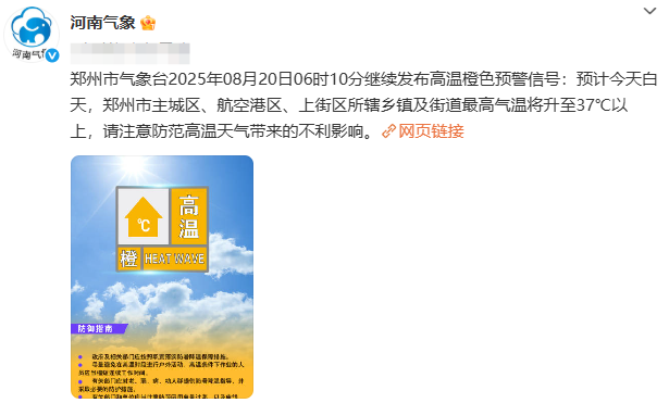 鄭州市氣象台2025年08月20日06時10分繼續發佈高温橙色預警信號:預計今天白天,鄭州市主城區、航空港區、上街區所轄鄉鎮及街道最高氣温將升至37℃以上,請注意防範高温天氣帶來的不利影響。