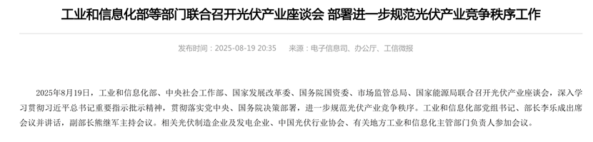 【環球網財經綜合報道】為進一步規範光伏產業競爭秩序,推動產業高質量發展,8月19日,工業和信息化部、中央社會工作部、國家發展改革委、國務院國資委、市場監管總局、國家能源局聯合召開光伏產業座談會。多家光伏製造企業及發電企業相關負責人蔘加會議。