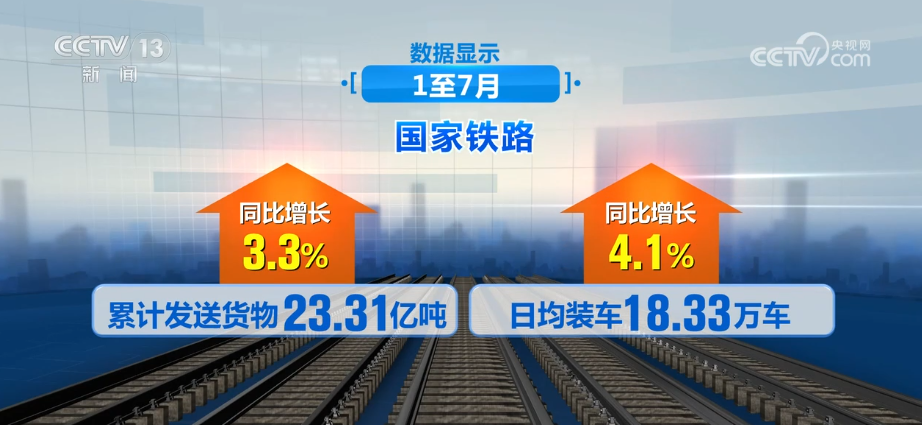數據顯示,1至7月,國家鐵路累計發送貨物23.31億噸、日均裝車18.33萬車,同比分別增長3.3%、4.1%。