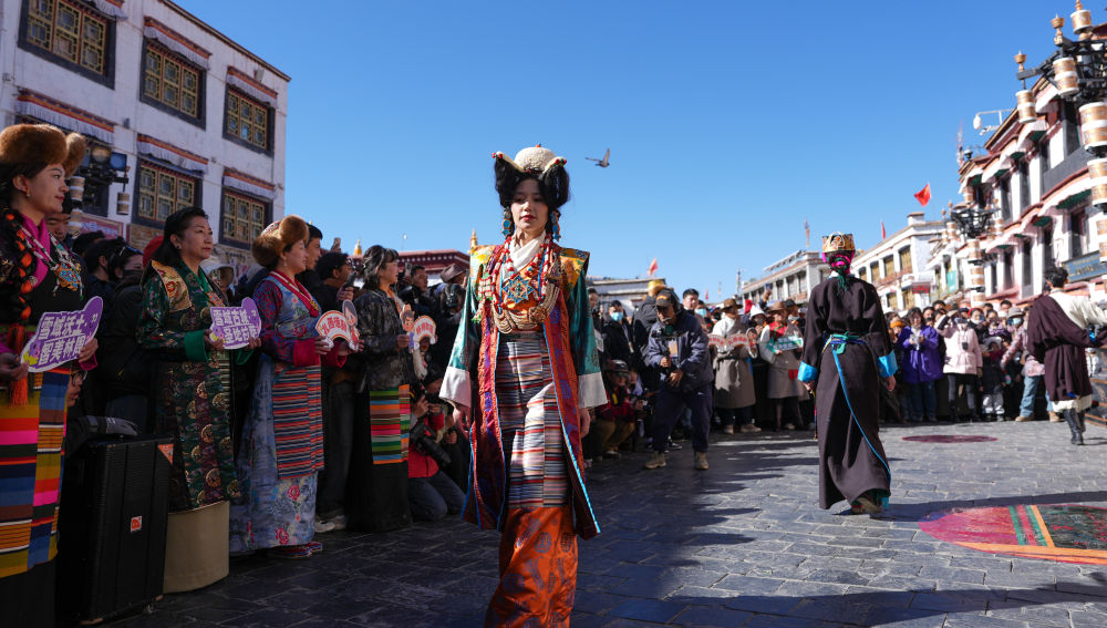 2025年1月3日,“拉薩新年服飾秀”上模特在拉薩八廓街巡遊。新華社記者 晉美多吉 攝