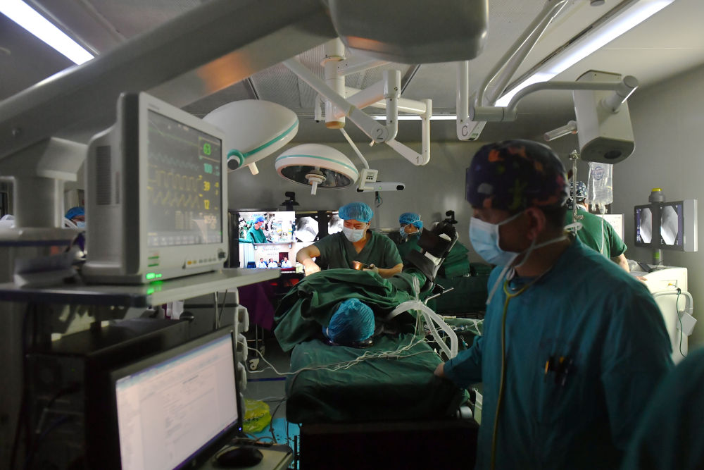 2021年4月19日,拉薩市人民醫院骨科醫生在北京積水潭醫院專家遠程指導下使用骨科機器人開展骨科手術。 新華社記者 孫瑞博 攝