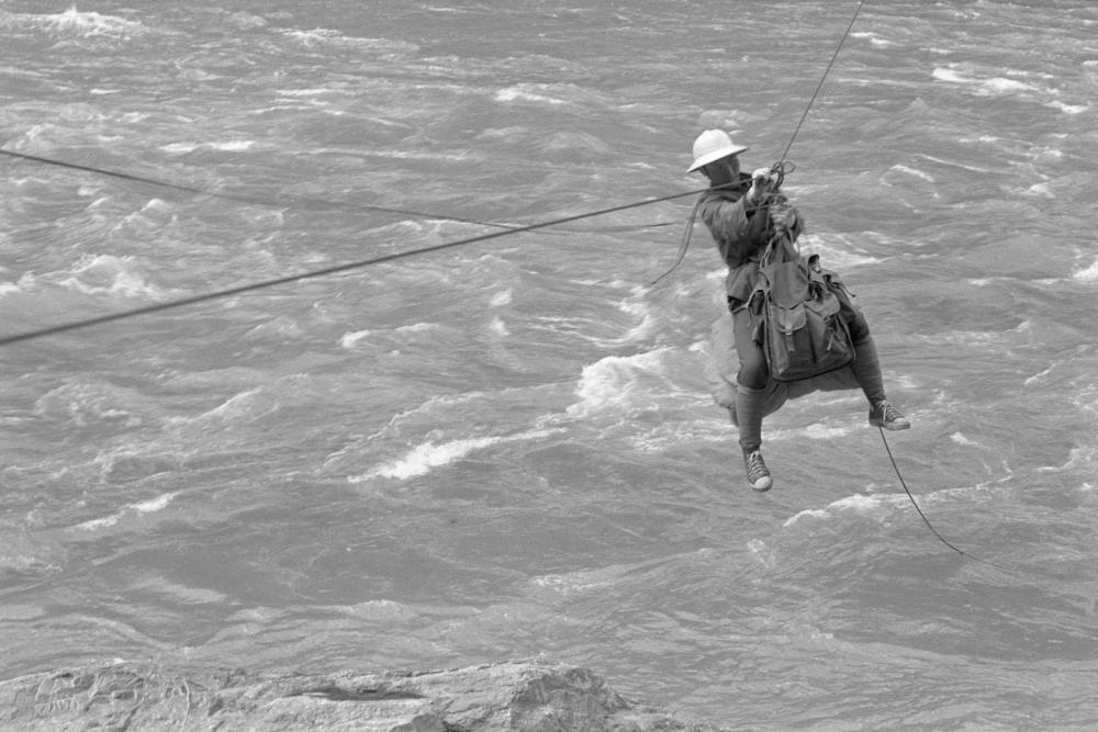 1983年,西藏林業局考察隊員通過雅魯藏布江上的溜索過江。新華社記者 土登 攝