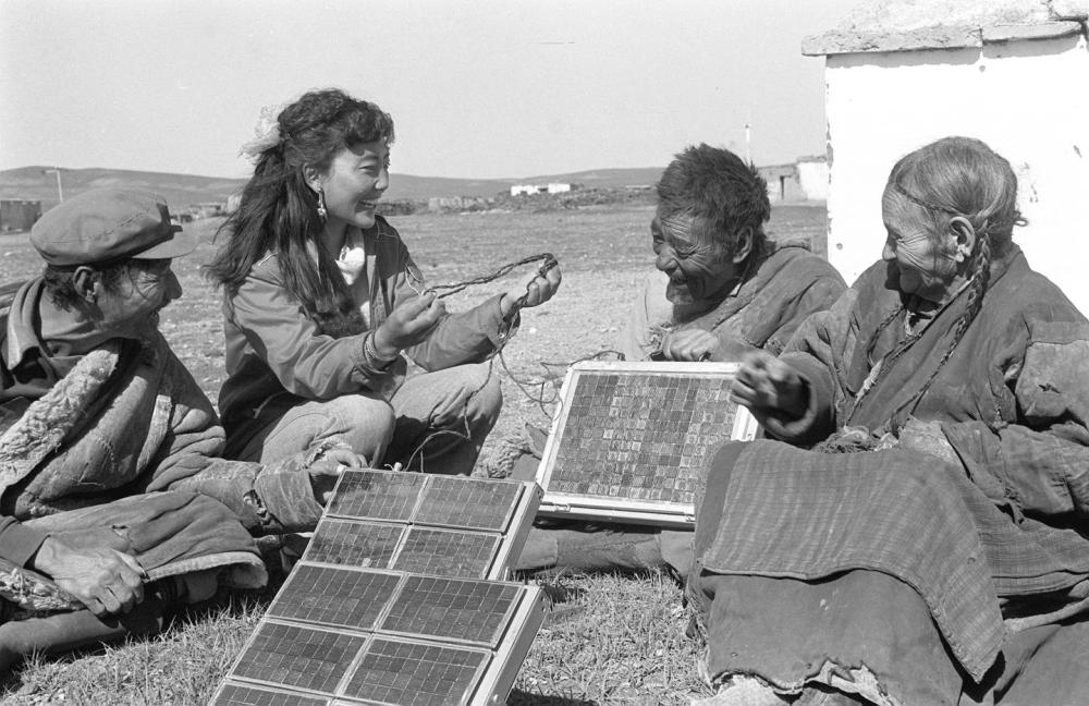 1986年3月,那曲地區(現為那曲市)科委工作人員齊美才央(左二)給牧民講解太陽能電池使用方法。新華社記者 才龍 攝