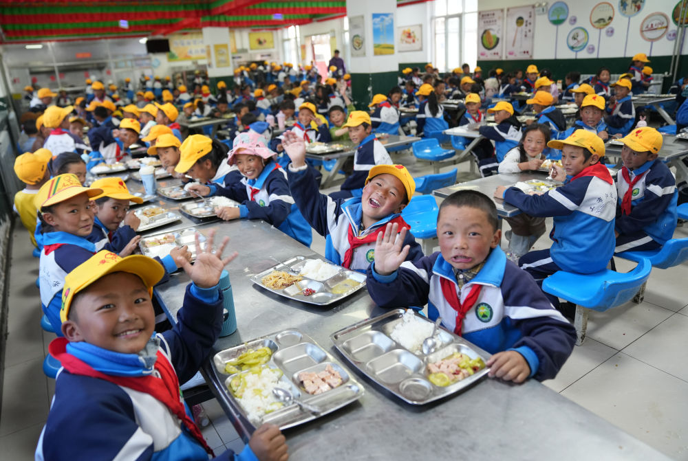 2024年9月3日,西藏林芝市工布江達縣娘蒲鄉中心小學的學生們在享用午餐。新華社記者 晉美多吉 攝