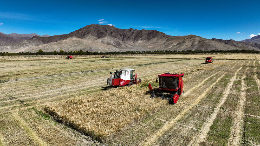 2022年9月19日,西藏日喀則市江孜縣熱索鄉努康村農機合作社的村民集中對村裏三千多畝耕地進行機械化收割。新華社記者 晉美多吉 攝