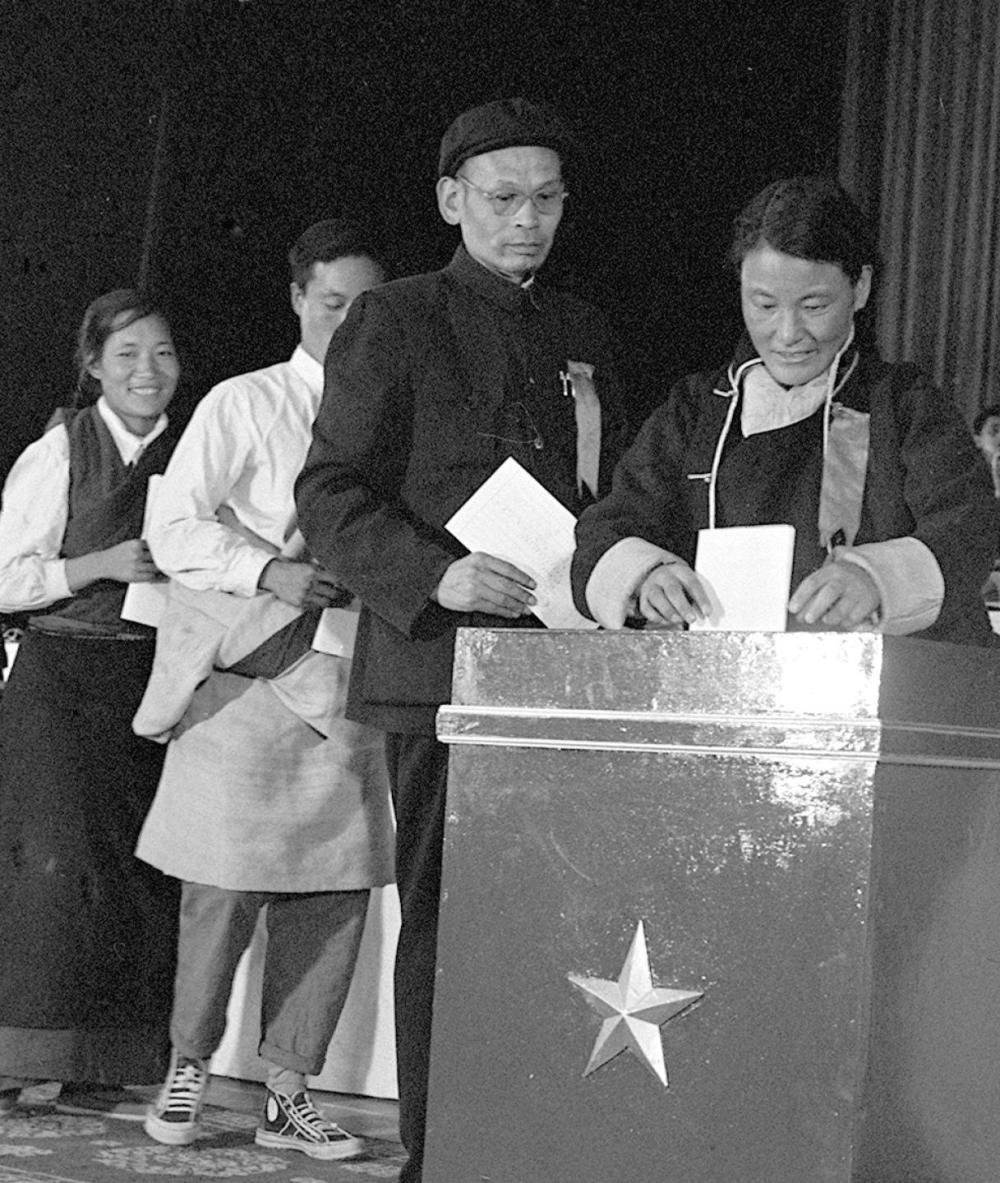 1965年9月,西藏自治區第一屆人民代表大會第一次會議的代表次仁拉姆(右一)正在投票。新華社記者 袁克忠 攝