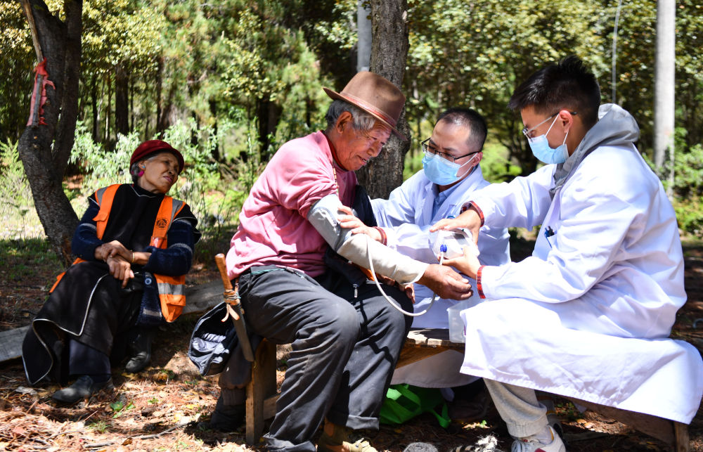 2023年6月12日,廣東援藏醫生王振疆(右二)和本地醫生尼瑪益西(右一)在西藏米林市吞布容村,給村民普布多吉檢查身體。新華社記者 晉美多吉 攝