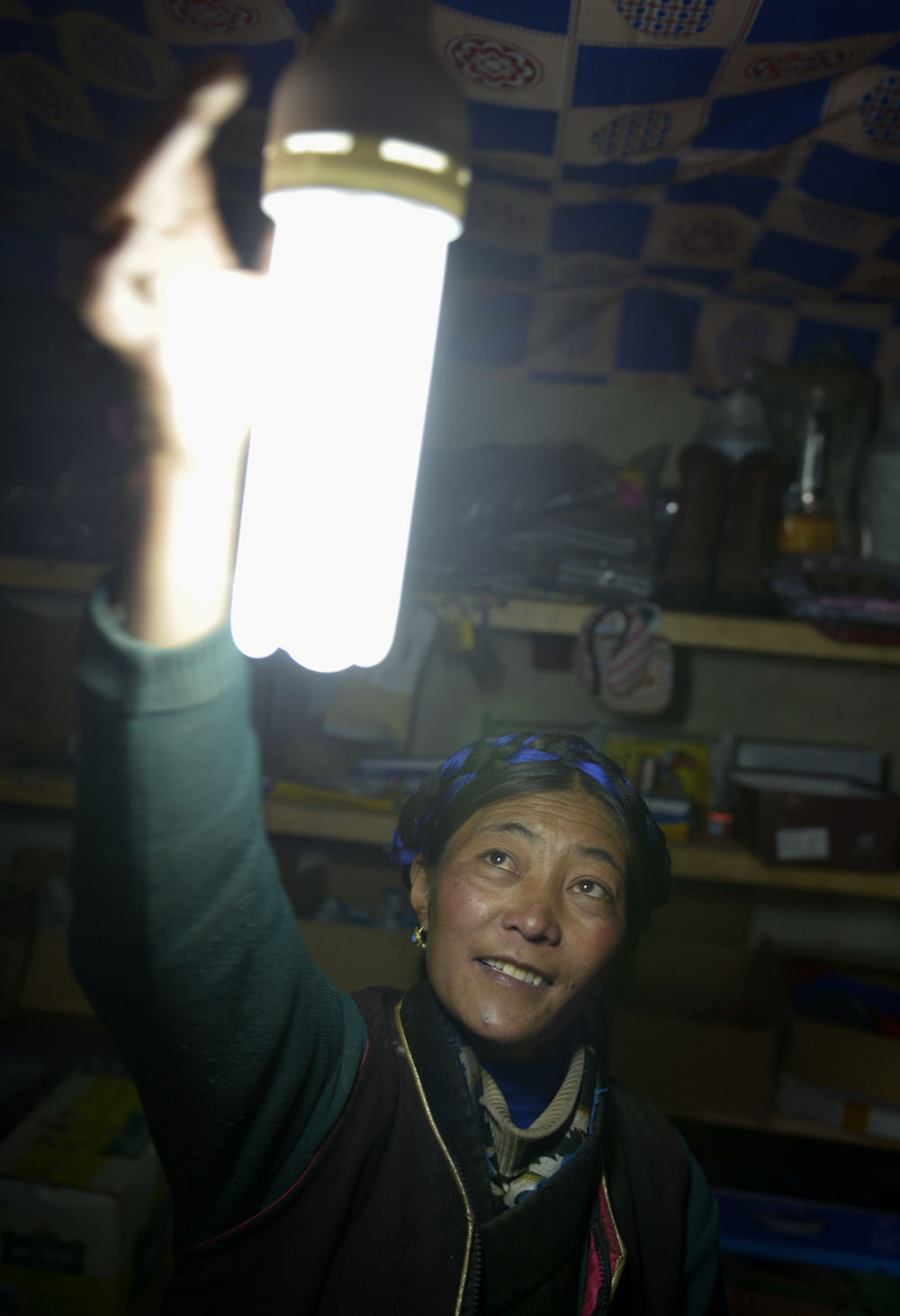 2013年6月7日,西藏浪卡子縣普瑪江塘鄉牧民在家裏使用太陽能照明設備。新華社記者 普布扎西 攝
