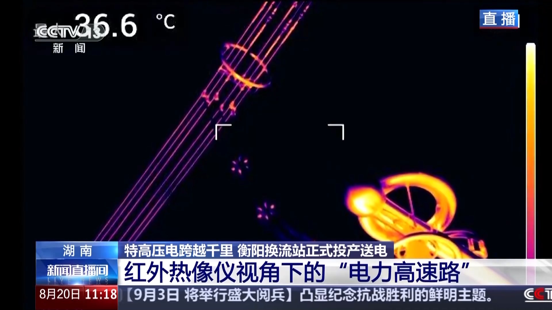 紫紅色勾勒出鐵塔和線路的形狀,測得電線的温度是36.6℃和37.1℃,和衡陽户外的温度基本一致。但大家要知道的是,這是在特高壓帶電運行的狀態,線路要通過5000安電流,還被太陽暴曬的情況下,線路沒有過熱,温度和環境温度一致,這説明這套特高壓直流輸電工程線路損耗很小。