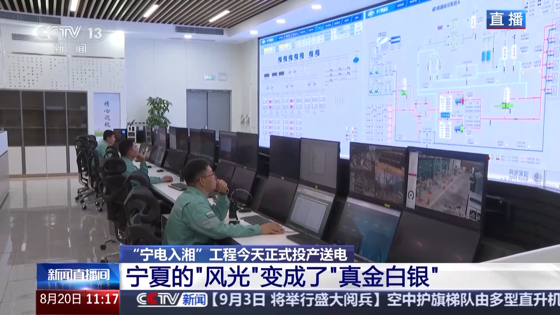 *總枱記者 柴丹楓:*我現在在寧電入湘的起點寧夏中寧換流站的一個高點上,經過兩年的開工建設和試運行,今天±800千伏特高壓直流電將正式向湖南輸送,意味着來自塞上的綠電、清潔電將從這裏彙集、出發。我現在所在的位置雖然是無電區,但是我們在現場能聽到啪啪的聲音,工作人員介紹這就是輸電的聲音,您知道嗎?從寧夏到湖南輸電只需要0.005秒,通俗講就是二百分之一秒,也就是説連一眨眼的時間都用不上,就可跨越上千公里,直通湖南。下面我先給大家介紹一下這條“電力高速路”,這是一條主要用來輸送沙漠、戈壁和荒漠地區風電和光伏電的特高壓線路,這條“電力高速路”可以説把西北和湖南緊緊相連,就像一條看不見的高速公路,一端在寧夏中衞,另一端連接湖南衡陽。