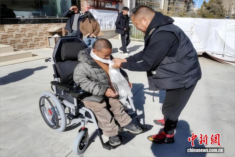 扎西平措為巴熱村殘障人士發放輔助設備。 受訪者供圖
