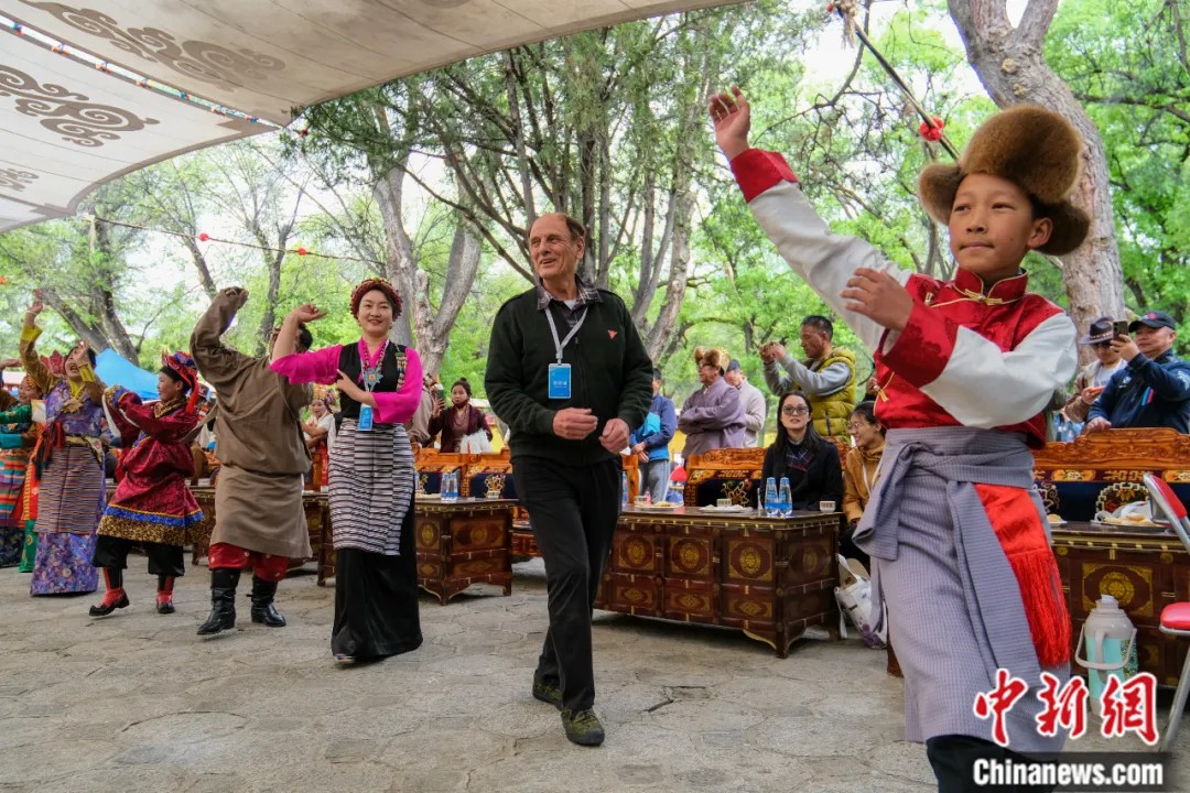 2023年5月19日,柯馬凱在拉薩羅布林卡聽藏戲,和當地藏族民眾一道跳鍋莊舞。中新社記者 江飛波 攝