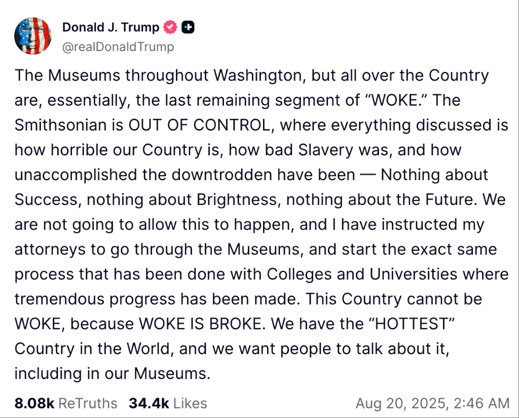 特朗普説,他已指示律師團隊審查這些博物館,並啓動與針對高校“完全相同”的程序,對這些博物館採取措施。他表示,美國不能容許“覺醒”文化存在,因為“覺醒”意味着國家分裂。