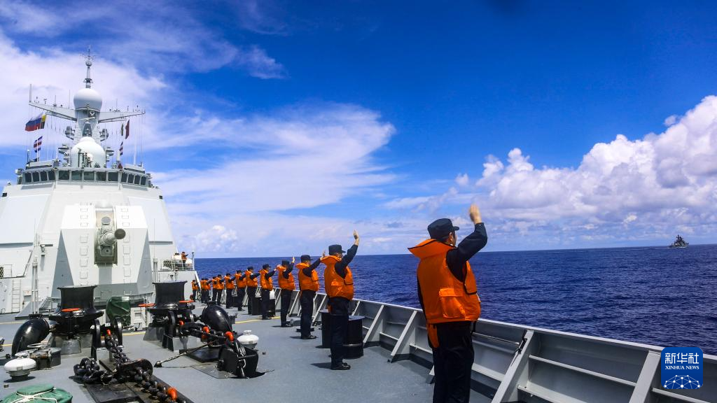 8月20日,中俄海上聯合編隊在西太平洋某海域舉行分航儀式,中方參演官兵向俄方艦艇揮手告別。新華社發(徐強攝)