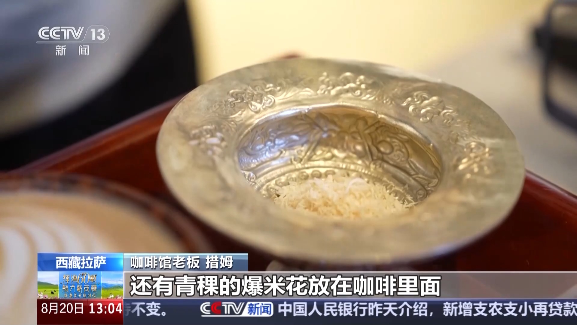 *咖啡館老闆措姆:*這款是我們店裏面賣得最火爆的一款原創產品——拉薩拿鐵,我們準備了犛牛奶的奶渣、酥油、青稞的爆米花放在咖啡裏,讓客人體驗到西藏本地食材和咖啡融合的感覺。