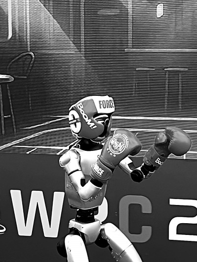上步、閃避、刺拳……格鬥場地內,戴護具的機器人拳擊手使出一套精彩的格鬥連招,讓觀眾大呼過癮!