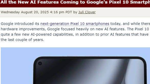 【環球網科技綜合報道】在智能手機市場競爭日益激烈的當下,人工智能功能已成為各大廠商角逐的新戰場。8月21日,據外媒MacRumors報道,谷歌日前推出了其下一代Pixel 10智能手機,這款手機不僅在硬件上有所升級,更是在AI功能方面大放異彩,給蘋果iPhone 17系列似乎帶來了不小的壓力。