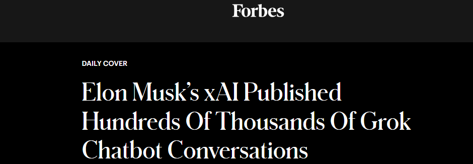 《福布斯》報道稱,xAI公佈了Grok與用户之間數十萬次對話的聊天記錄。當Grok用户點擊“分享”按鈕時,會生成一個唯一網址用於分享對話,但這個網址同時也會被提供給谷歌、必應等搜索引擎,導致對話內容可被任何人搜索到。這意味着,用户在不知情的情況下,其與Grok的對話就已被髮布到了Grok的網站上。