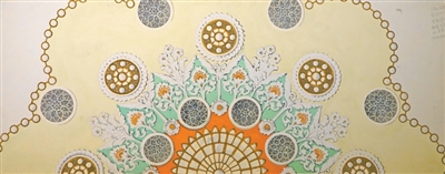 受敦煌藻井圖案啓發,常沙娜在天頂中央設計了一朵唐風圓形浮雕大花。“只設計花瓣不行,得把通風口及照明燈組合在裏面。”工程師張鎛點醒了她。經過連夜修改,最後完成的設計方案,把唐代的花飾圖案與通風、照明的功能需求及不同材質的組合統一起來,再用敦煌風格的富麗圖案組織。