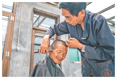搬來板凳、拿出推子,桑建國開始給海松理髮。“之前,老書記和我父親經常給海松理髮,現在他們年齡大了,這活兒就由我接了過來。”桑建國説。