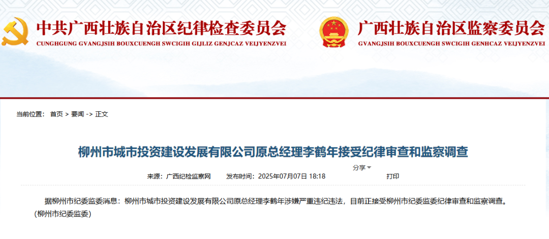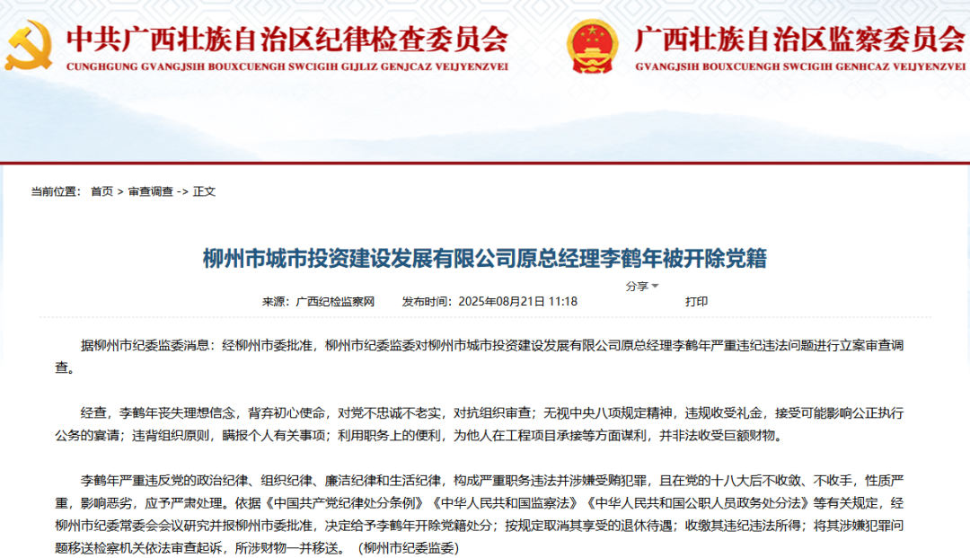 廣西紀檢監察網8月21日發佈消息:經柳州市委批准,柳州市紀委監委對柳州市城市投資建設發展有限公司原總經理李鶴年嚴重違紀違法問題進行立案審查調查。