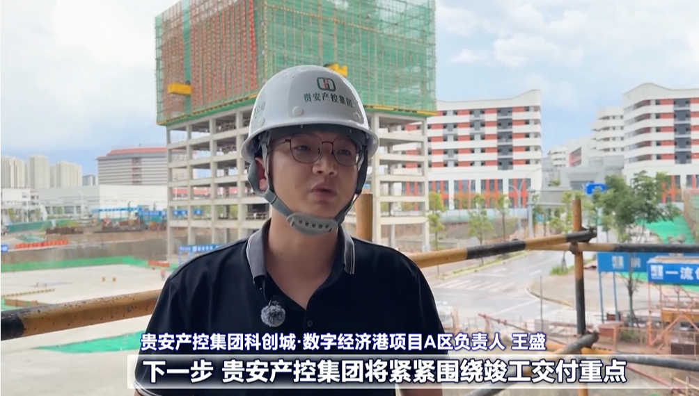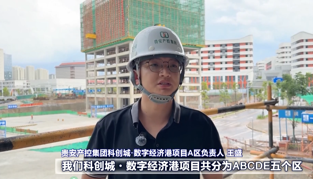 *貴安產控集團科創城·數字經濟港項目A區負責人 王盛:*這個項目共分為A、B、C、D、E五個區,主要為商業、公寓、辦公三個業態。目前在建為A區,共5個地塊、15棟樓,其中,已有4棟樓建成投用,剩餘在建11棟樓已全部完成封頂,項目整體建設進度達到65%,將於今年年底全面建成完工。