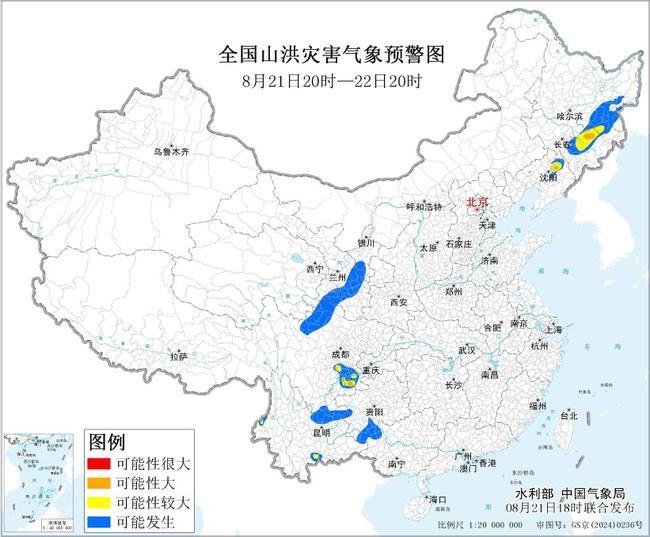 預計,8月21日20時至22日20時,遼寧東北部、吉林東部、黑龍江東南部、四川東南部、雲南西部、南部和東北部等地部分地區發生山洪災害可能性較大(黃色預警),其中,遼寧東北部、吉林東部、四川東南部局地發生山洪災害可能性大(橙色預警)。其他地區也可能因局地短歷時強降水引發山洪災害,請各地注意做好即時監測、防汛預警和轉移避險等防範工作。