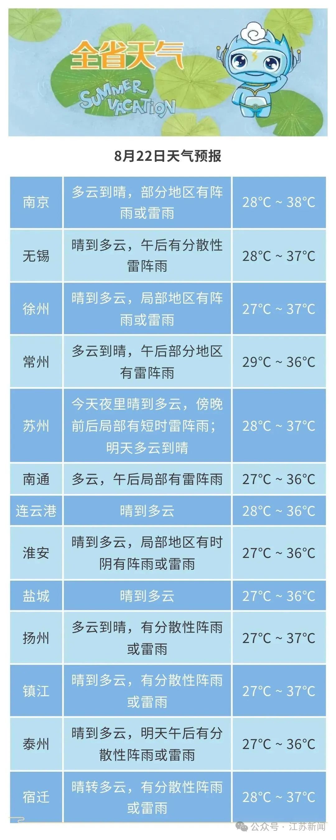 22日全省晴到多雲,其中沿江、蘇南和淮北局部地區午後有雷陣雨;